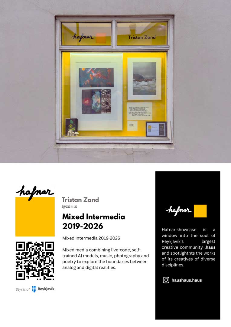 The works presented include captures from videos made from custom AI trained models, live-coding intermedia, sculptures, photography and poetry, excerpts from my work, and complementary to the reverse-AI works and performances that will be presented at the Resonance exhibition at Nullið Gallery from the 17th to the 22nd of the same month.